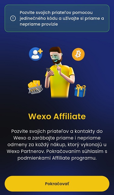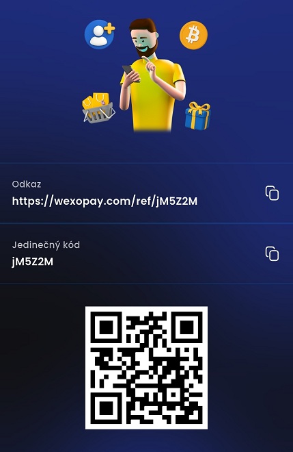 Každý kto si stiahne aplikáciu WEXO má zároveň možnosť pozvať priateľov a poslať im pozývací odkaz alebo pozývací QR kód. Tým pomôžete ušetriť vašim priateľom značnú sumu peňazí alebo im aj pomôžete vytvoriť si majetok. Za to, že šírite túto jedinečnú Super aplikáciu vám WEXO vyplatí z každého nákupu vašich odporúčaní a aj ich odporúčaní € na váš účet! Už pri tridsiatich ľuďoch s cca 300€ je to 90€ mesačne. Ak by tých tridsať vašich priateľov pozvalo tiež tridsať ľudí, tak vaša mesačná odmena by bola niekoľo tisíc eur mesačne. Bez toho aby ste čokoľvek museli kupovať alebo platiť.