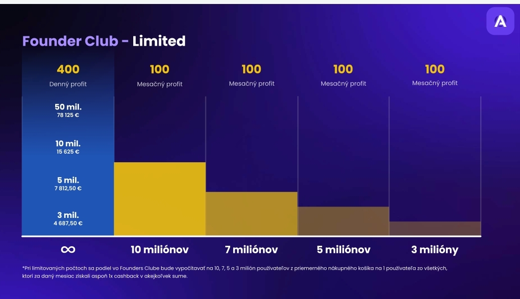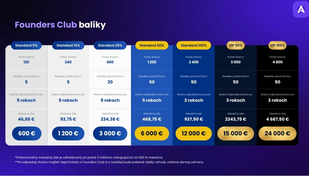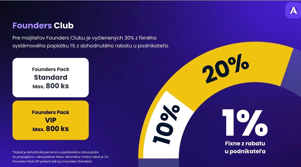 Každý kto sa stane členom klubu zakladateľov, vlastní balík podľa výšky investície. Balík Štandart 5% už od 600€ až po balík VIP v hodnote 24 000€. Z najzaujímavejšieho VIP balíka je už len posledných, voľných 67 kusov. Pri počte používateľov 3 milióny a mesačnej útrate 500€ vo WEXO aplikácii je vám vyplácaný presný percentuálny podiel vo výške 4 687,50€.