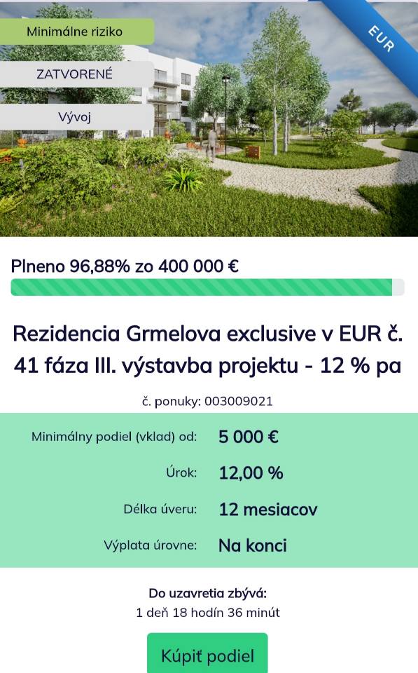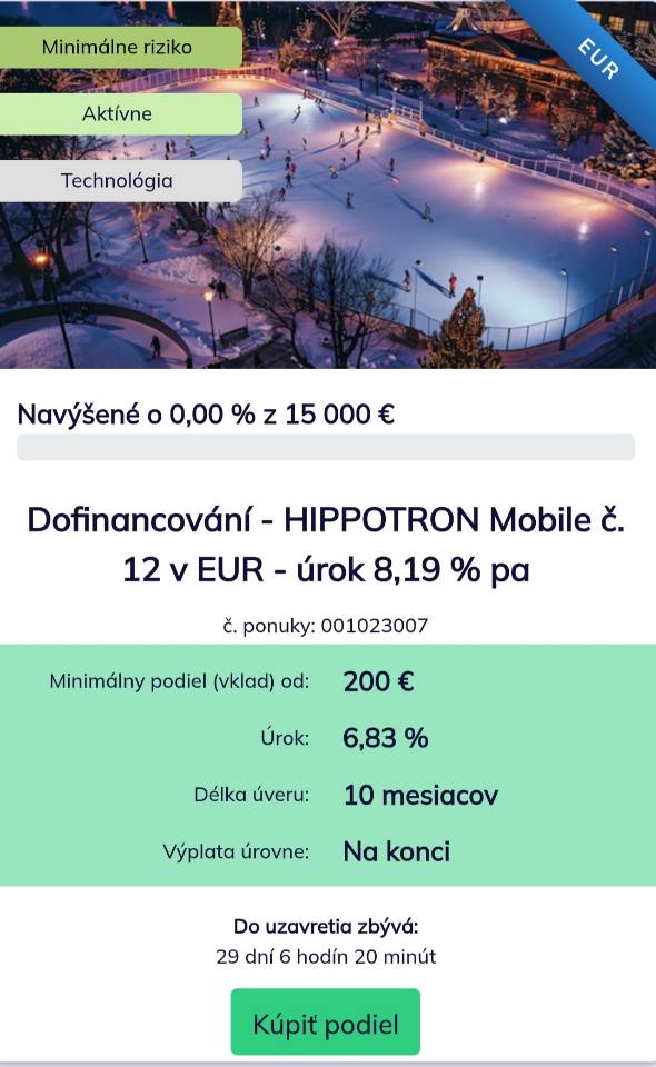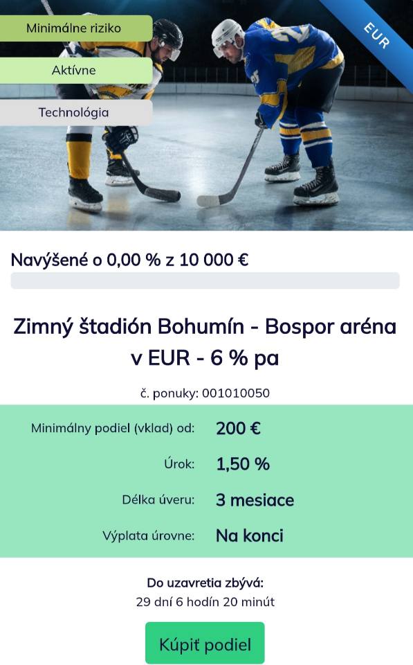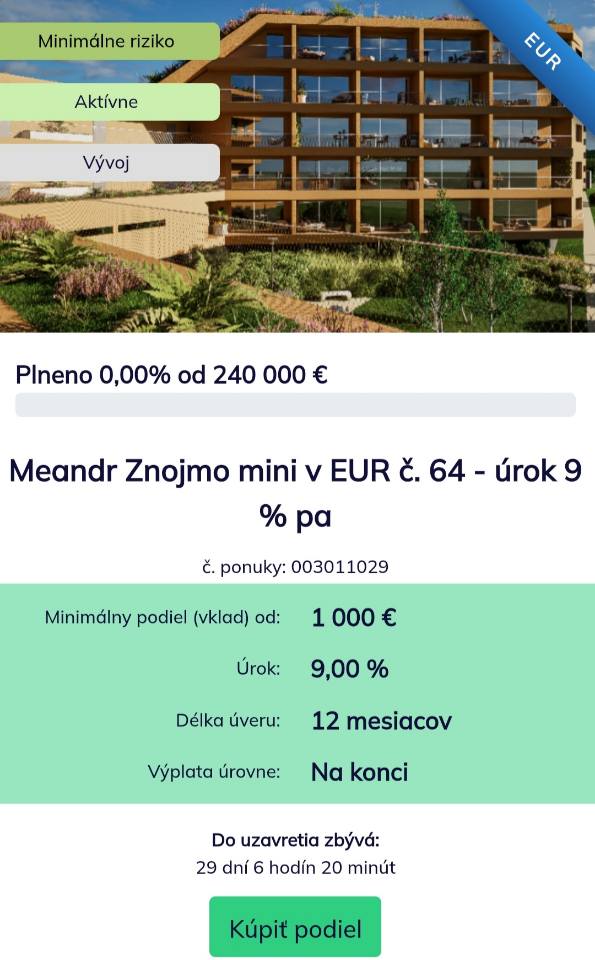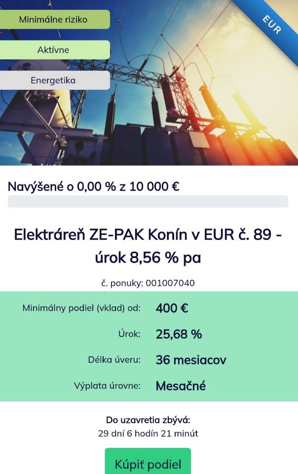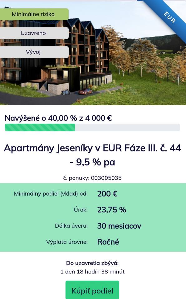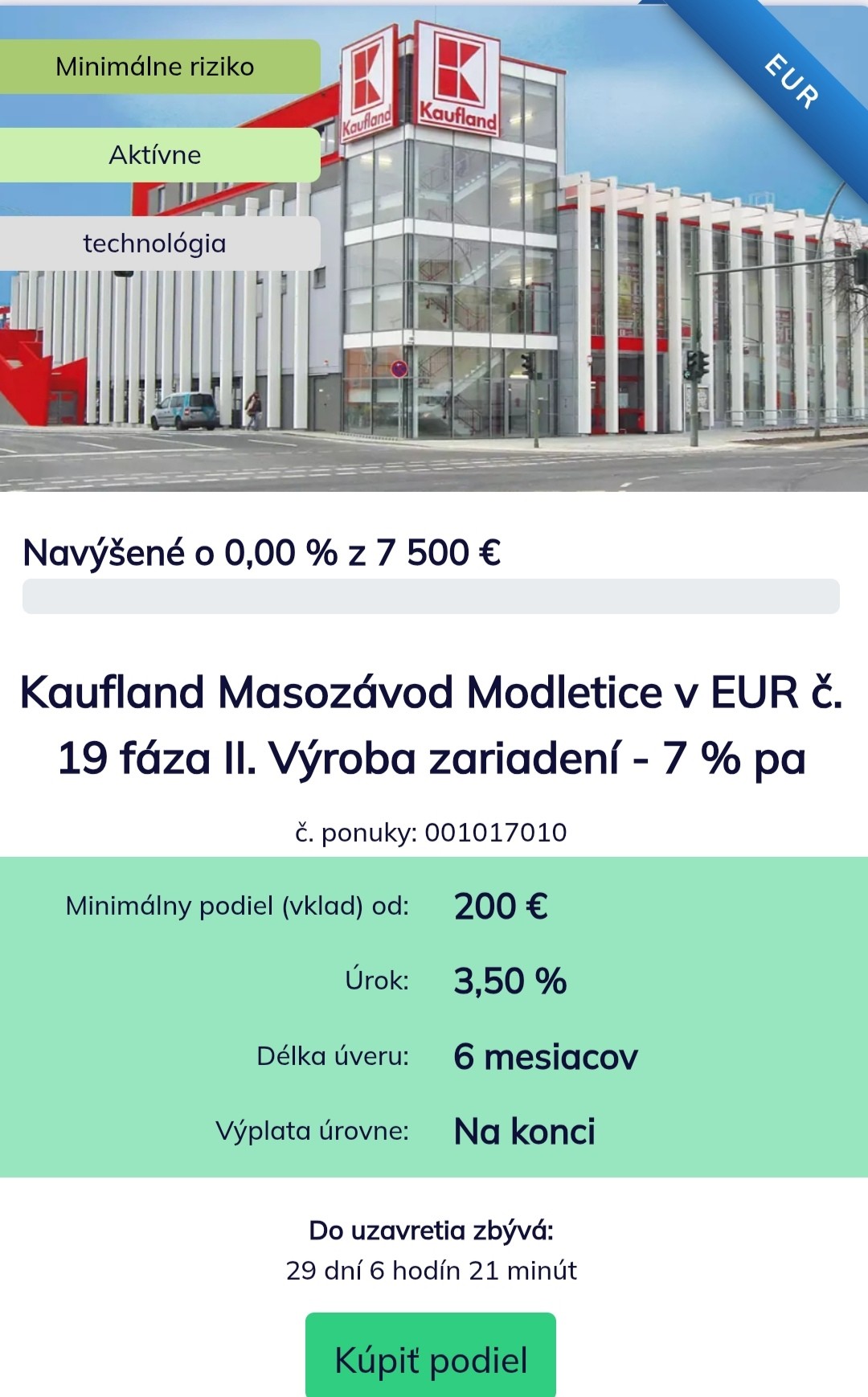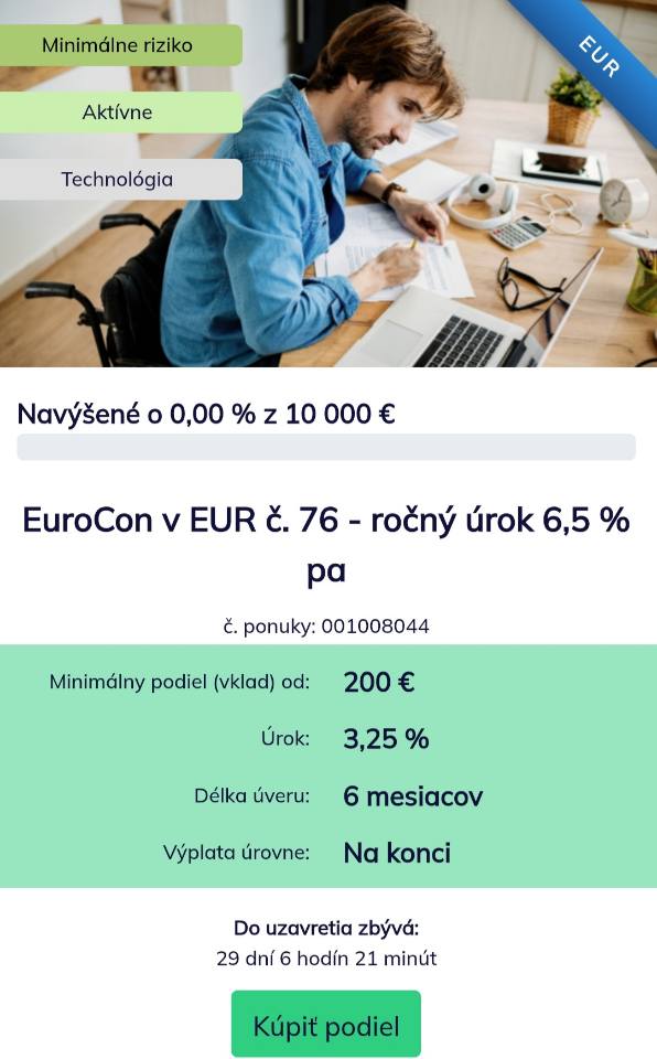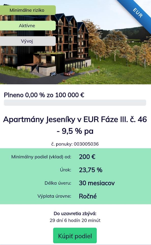 Parametre investícií záležia vždy od daného projektu. Minimálna investícia je už od 200€ a na tri mesiace s úrokom 1,5%, teda 0,5% mesačne. Niektoré projekty sú na 6 mesiacov, iné na 9 či 12. Najdlhšie sú na 36 mesiacov.